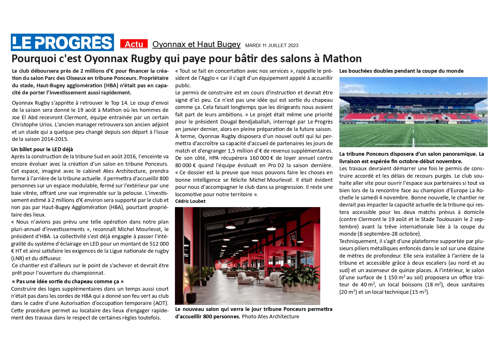 Le projet se situe sur la commune d’Oyonnax et consiste en l’extension de la tribune Ponceurs et la création d’un espace réceptif :